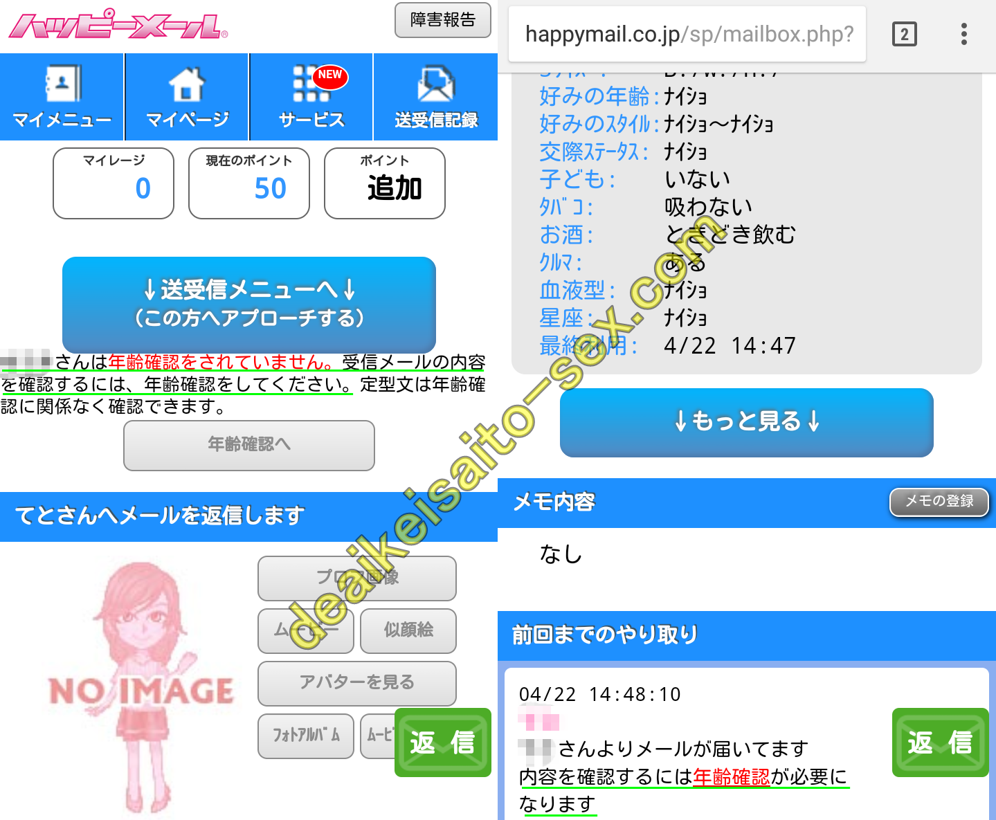 下の図はハッピーメールの例ですが、年齢認証(年齢確認)が済んでいない状態で出会い系サイトを利用すると女の子からメールが来ても【年齢確認をされていません。メールの内容を確認するには年齢確認が必要となります。】と表示され、女の子とのメールの送受信ができません。